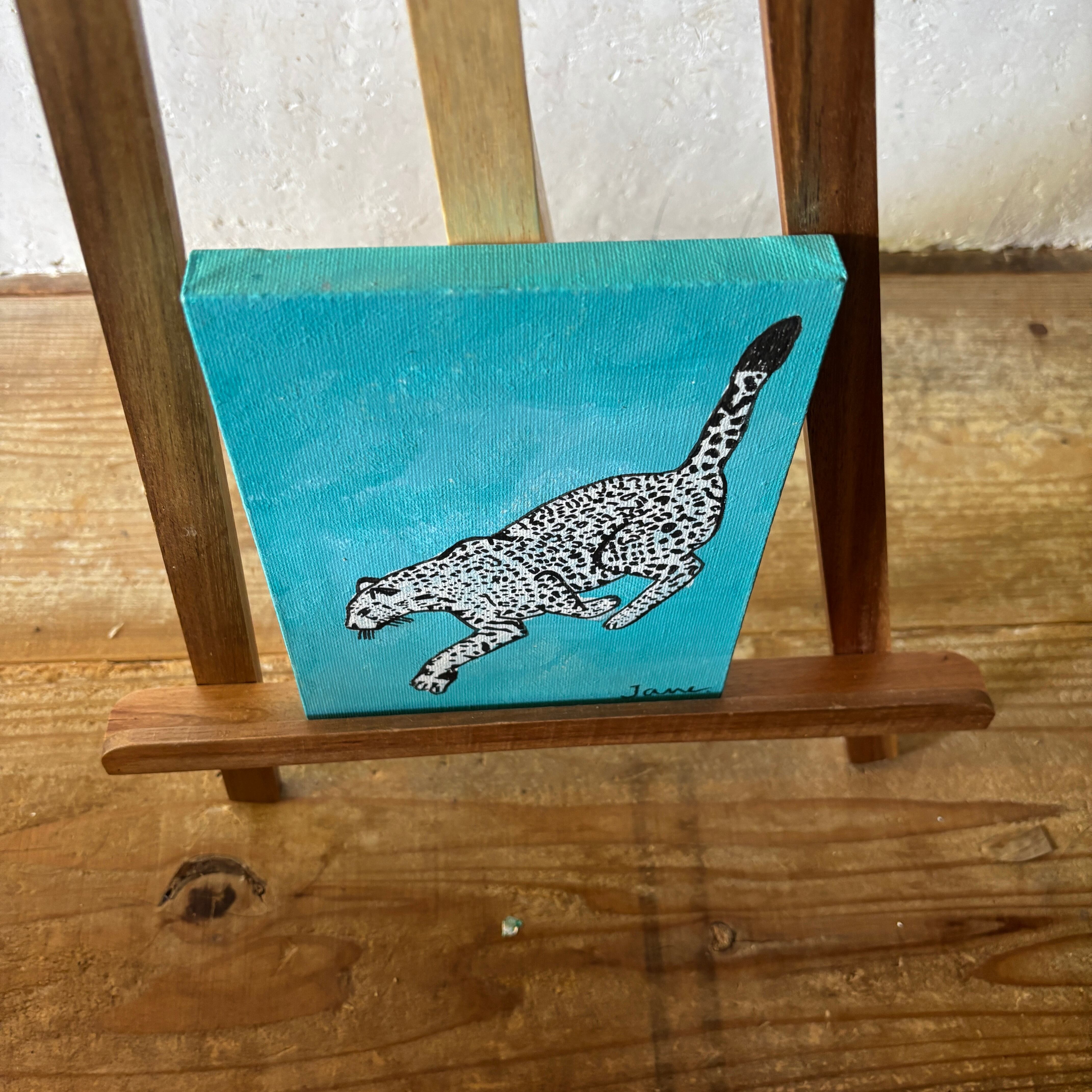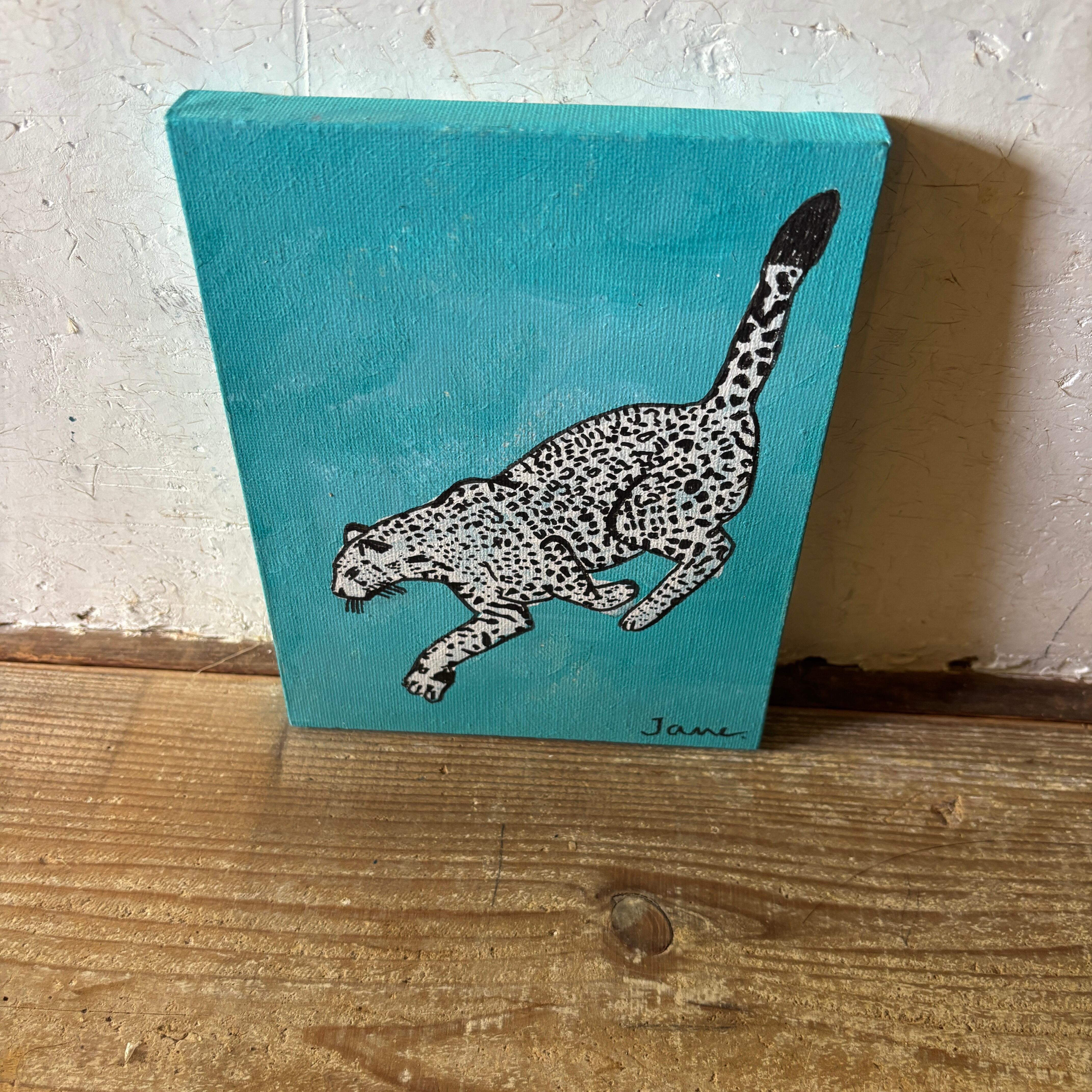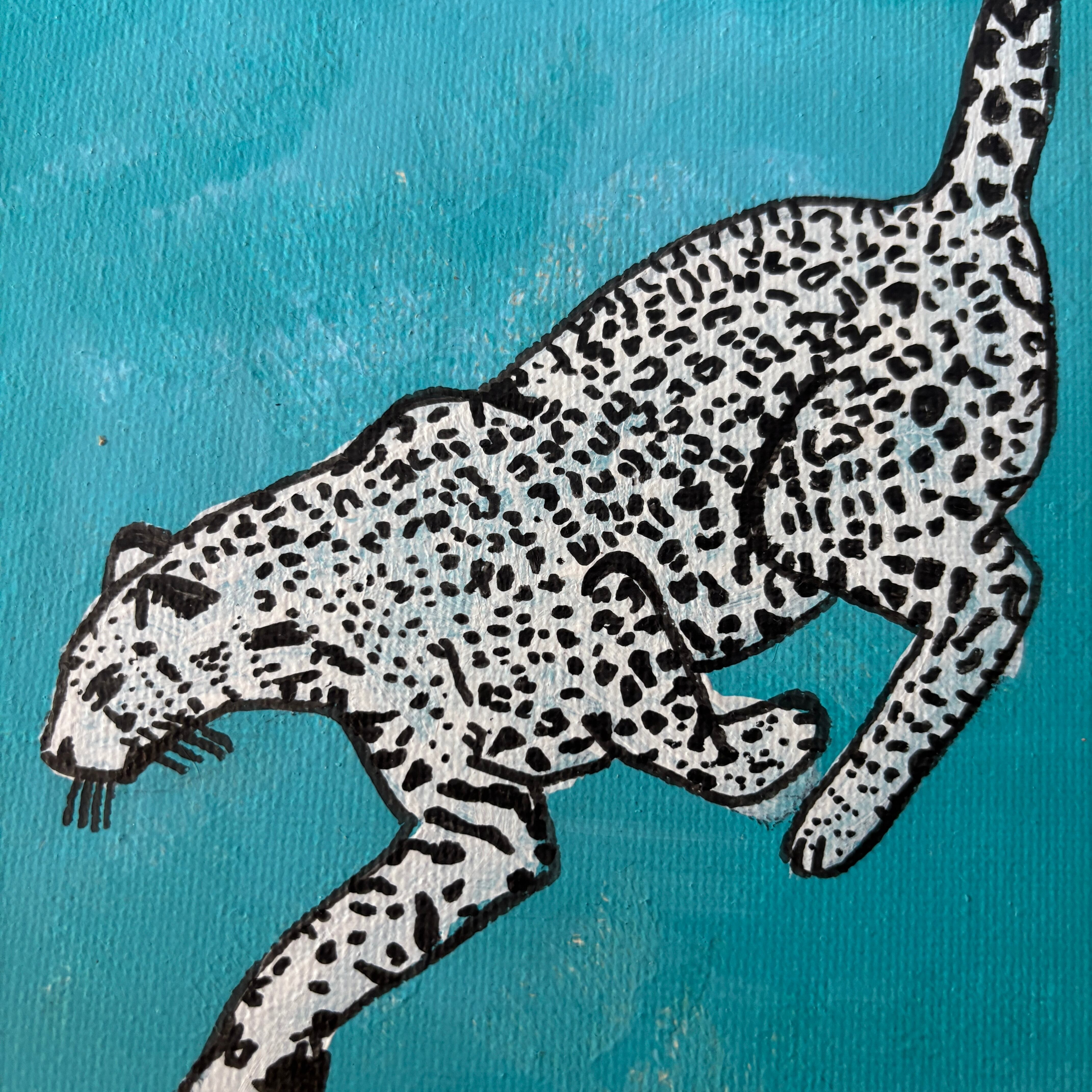 印象的なブルー系のバックグラウンドの中で豹が着地しようとしています。シャープな強さをエレガントに魅せる豹の姿、お楽しみください。
