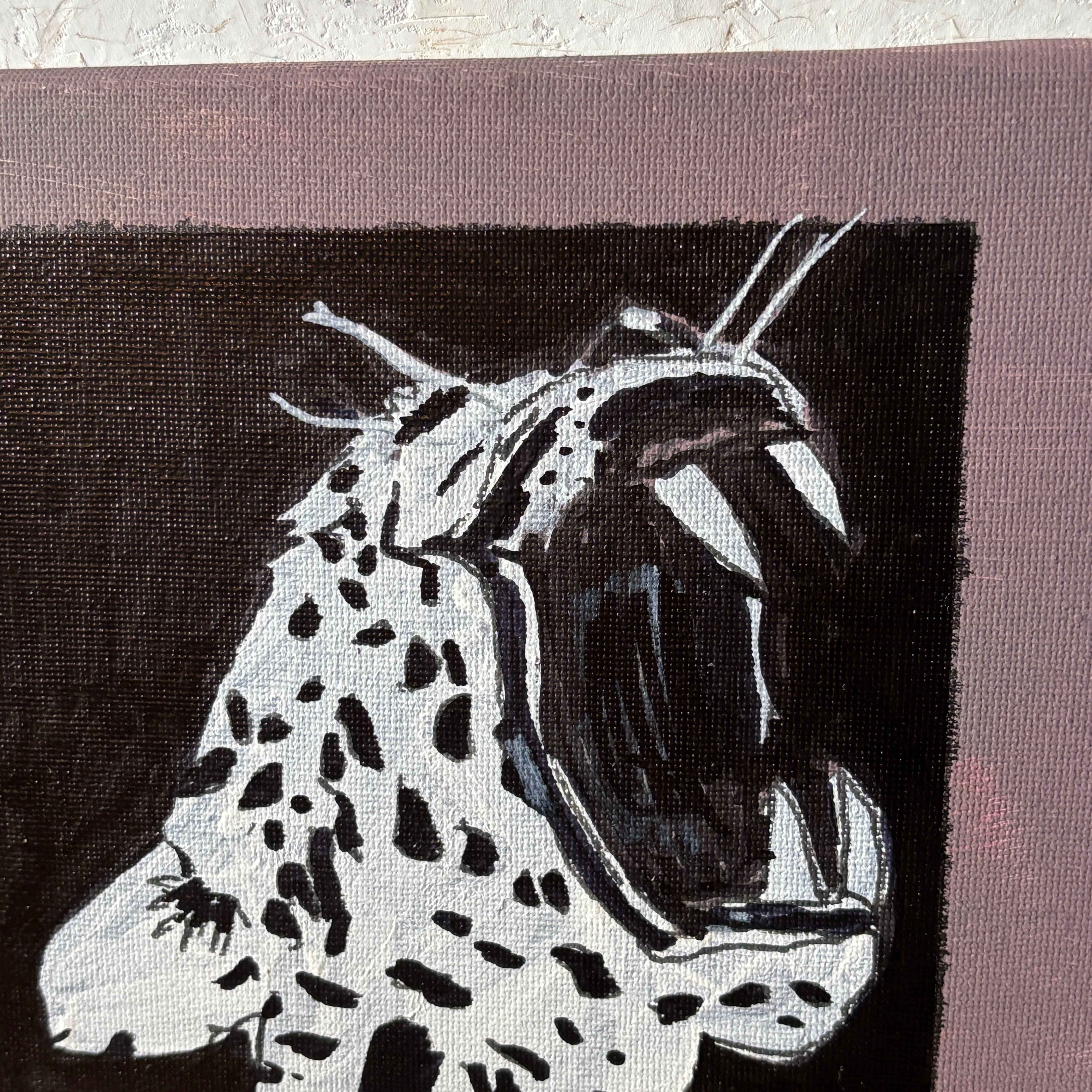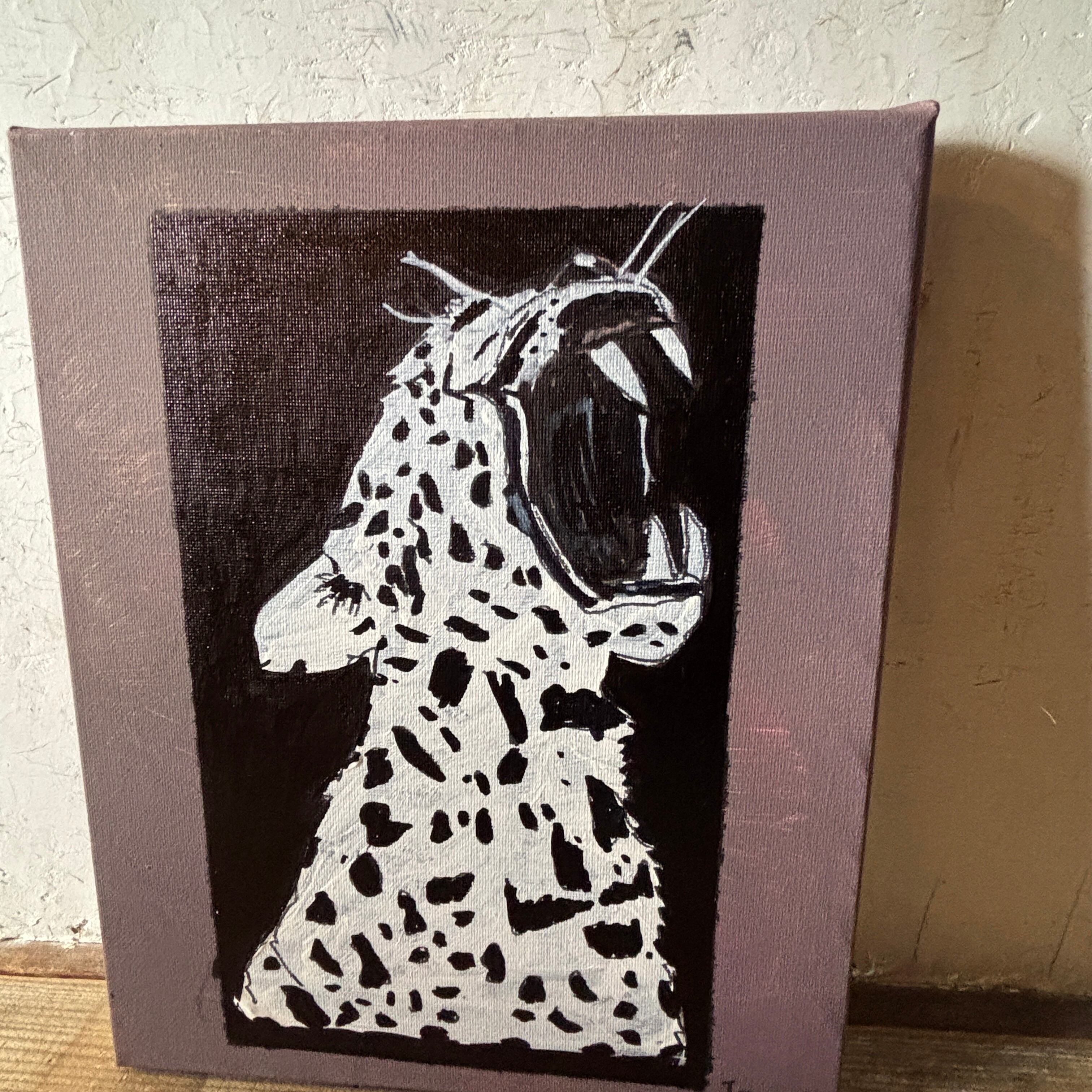 シックな紫系の背景に、黒の背景が重なりその中に吠える豹がいます。豹のbodyはアクリル絵の具、柄等は油性ペンで施してあります。黒背景も黒ペンです。