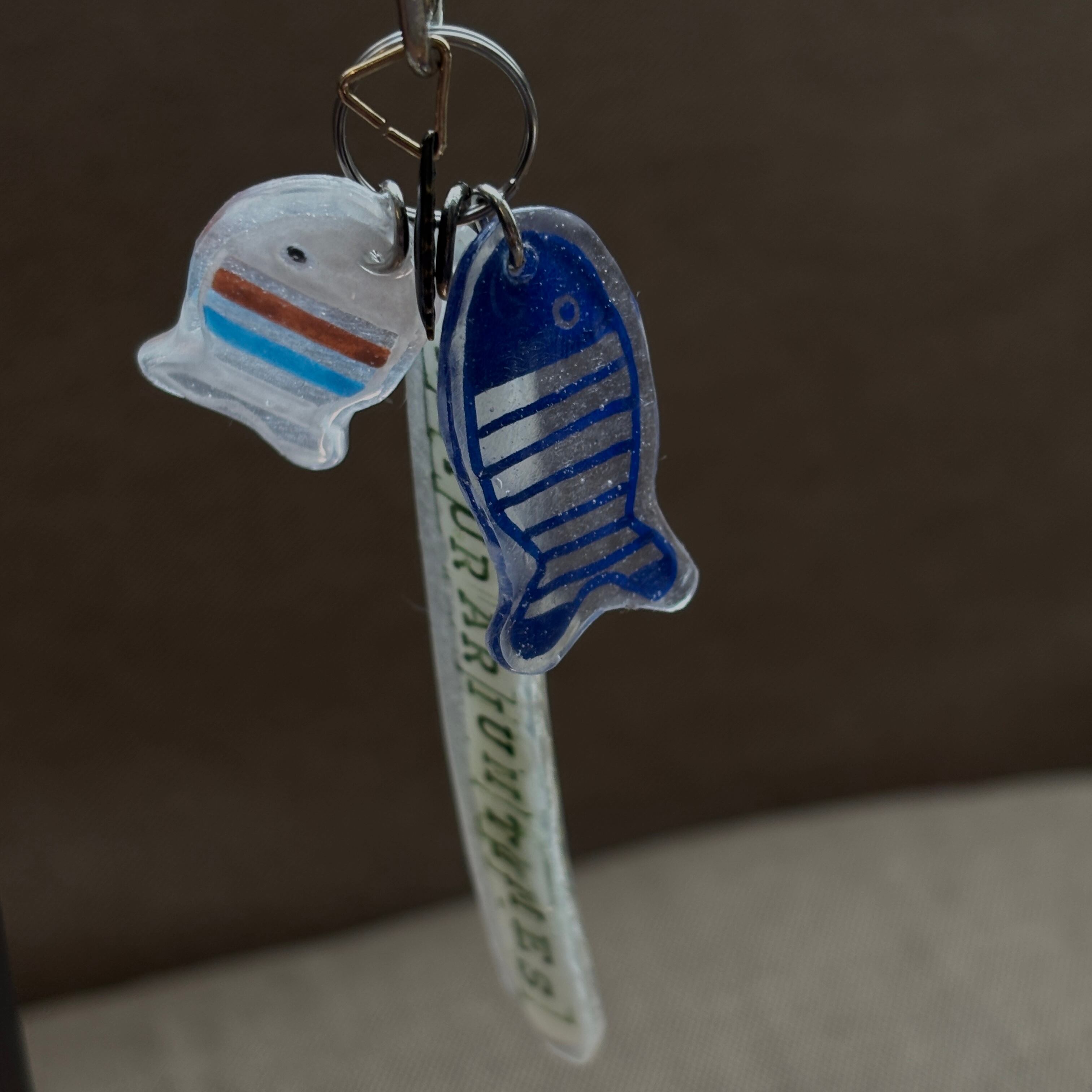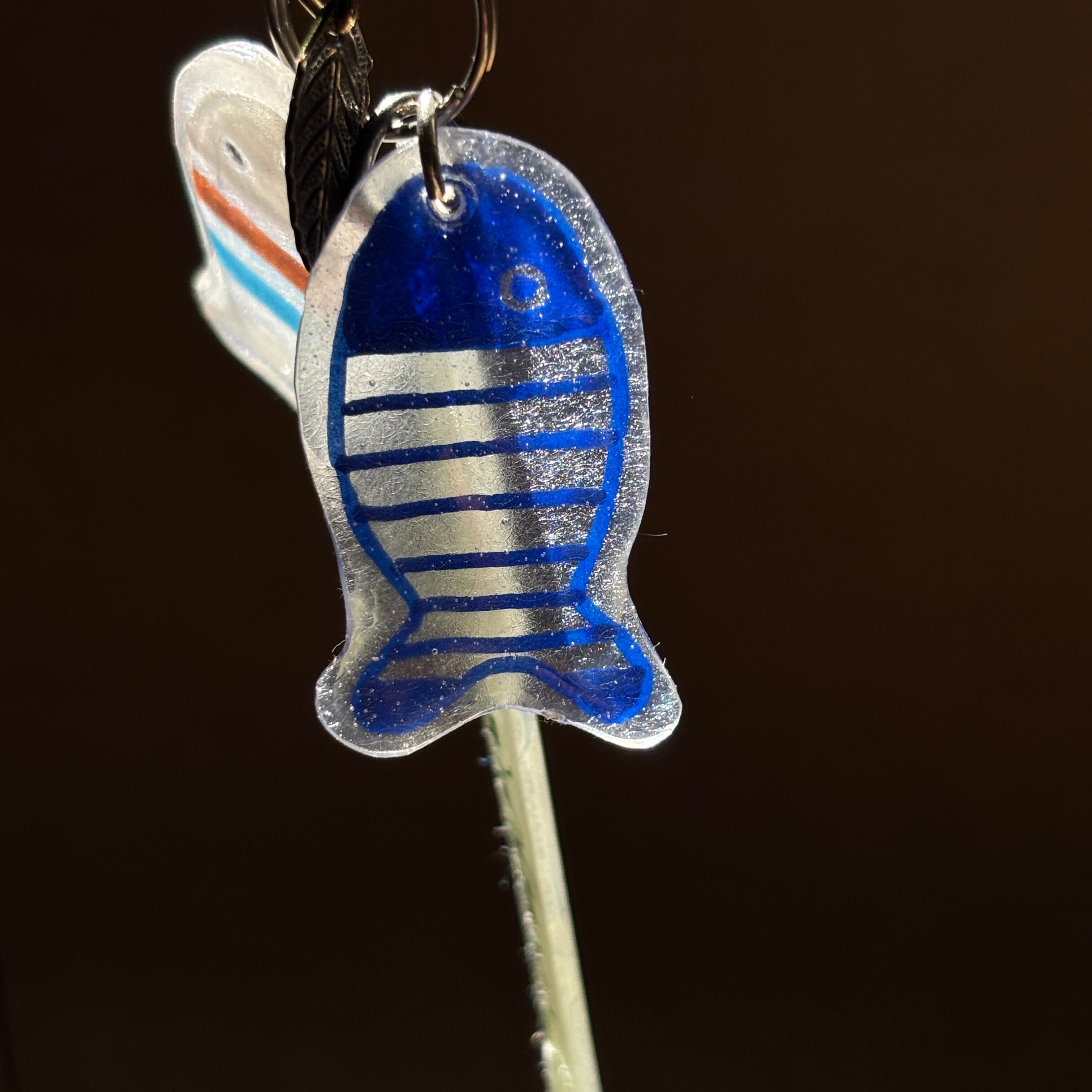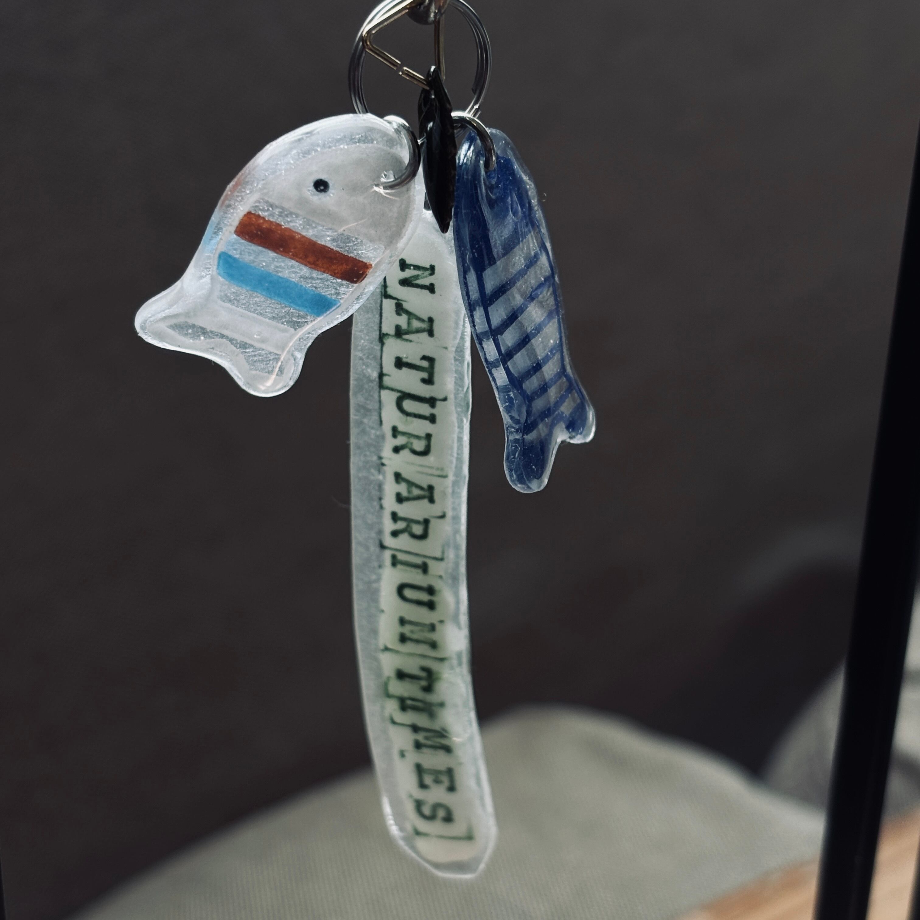プラ板で作ったさかなにレジンコーティングでぷっくり姿に。NATURARIUMTIMESのロゴアクセと葉っぱの形のチャームもついています。*さかな2匹ver.