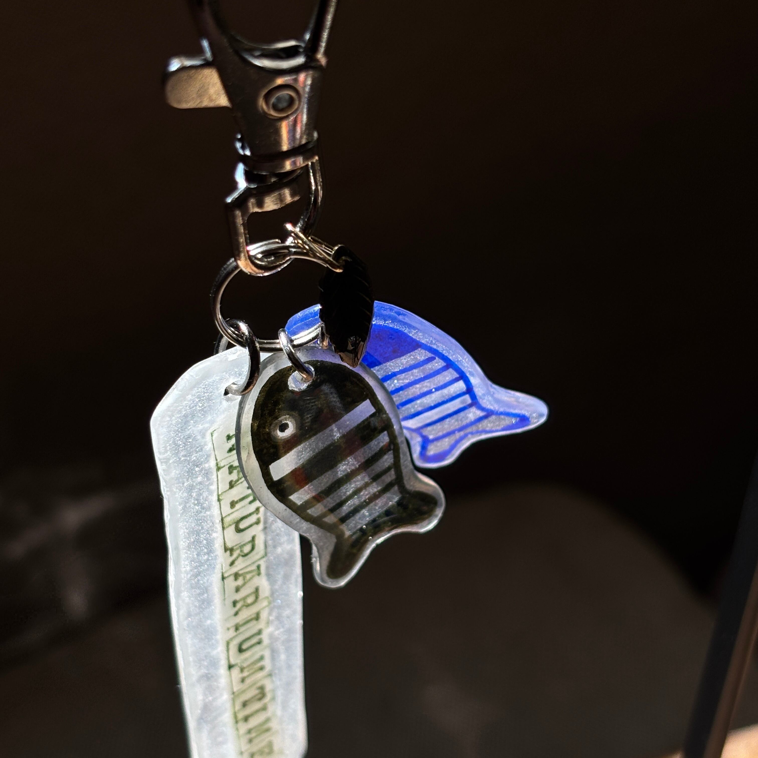 プラ板で作ったさかなにレジンコーティングでぷっくり姿に。NATURARIUMTIMESのロゴアクセと葉っぱの形のチャームもついています。*さかな2匹ver.