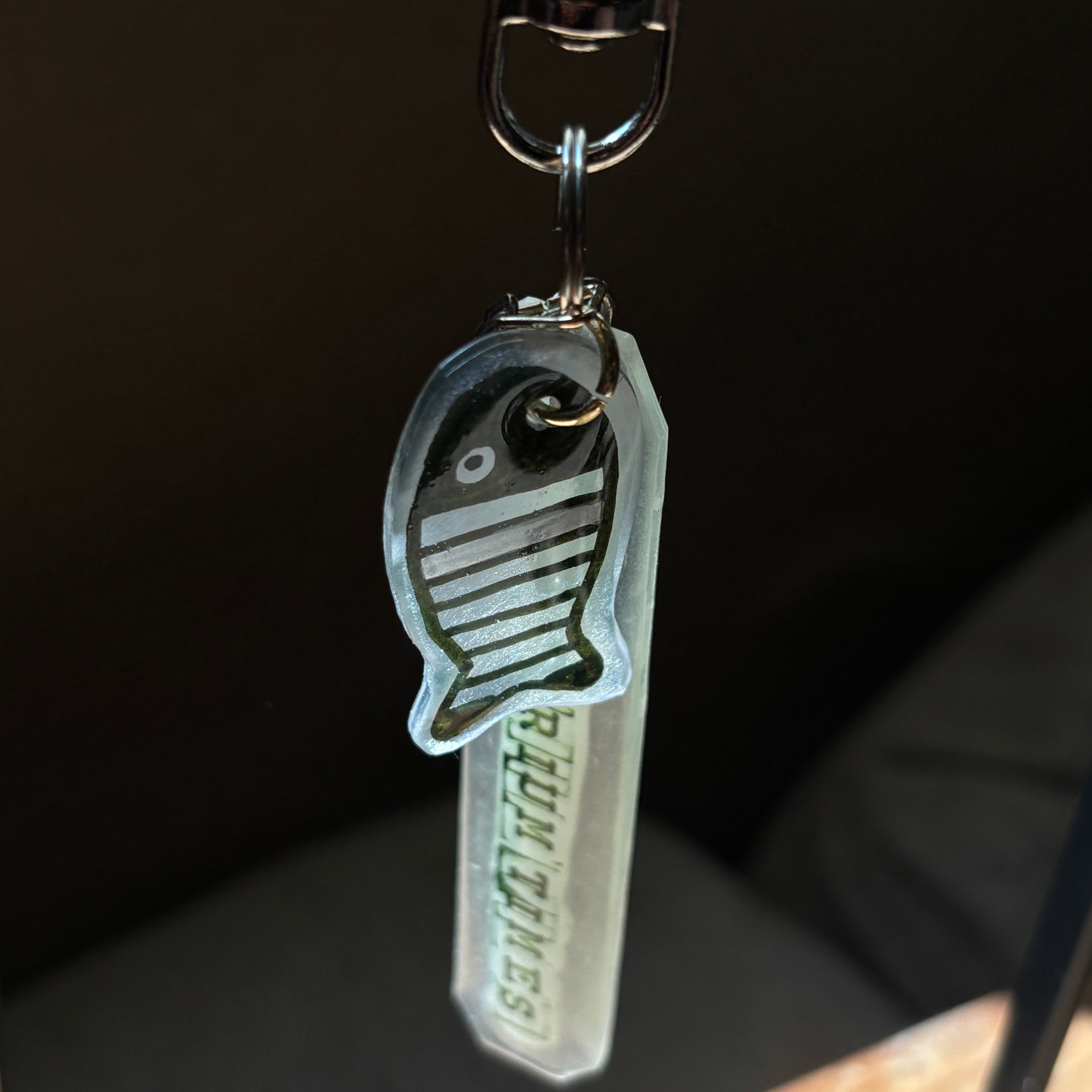 プラ板で作ったさかなにレジンコーティングでぷっくり姿に。NATURARIUMTIMESのロゴアクセと葉っぱの形のチャームもついています。*さかな1匹ver.