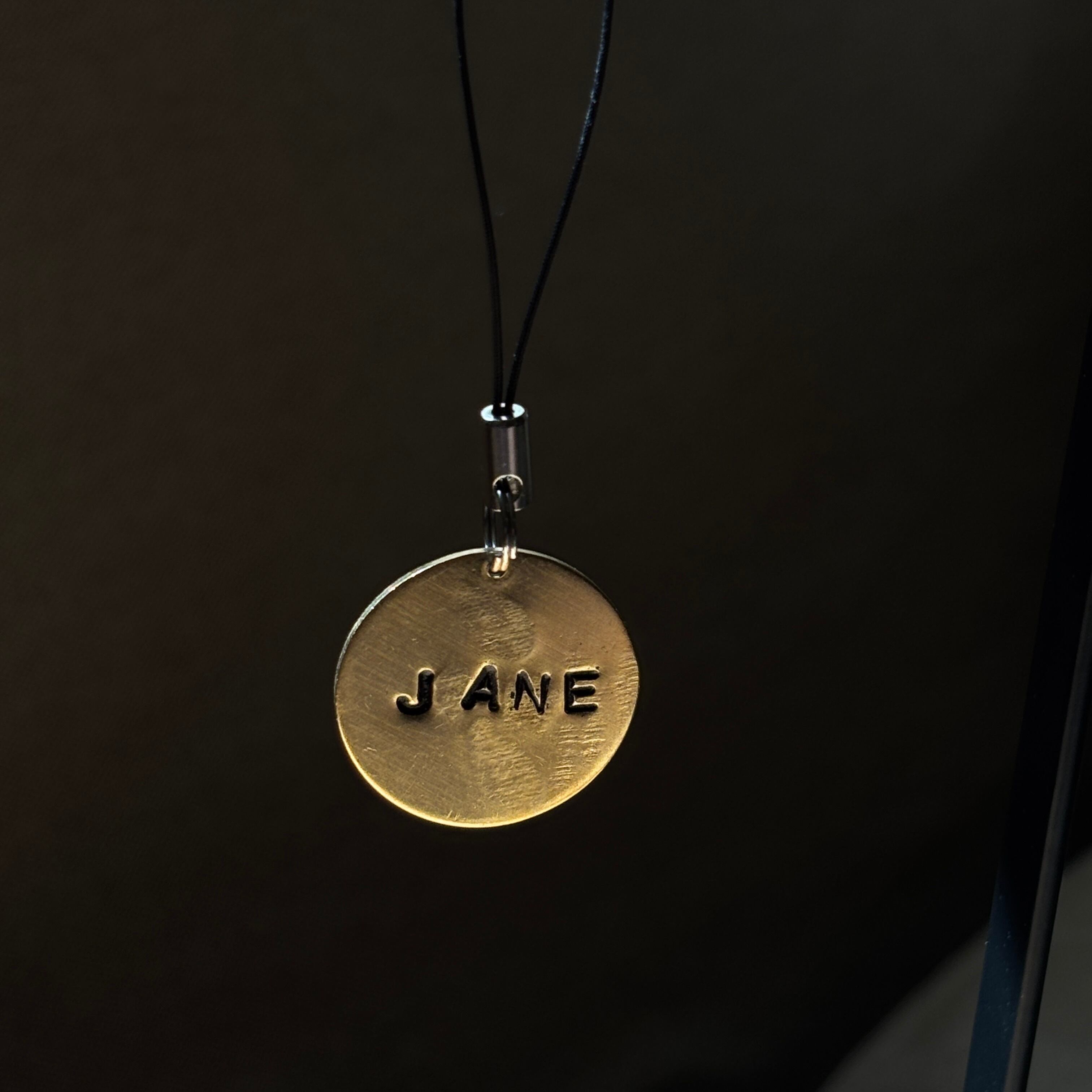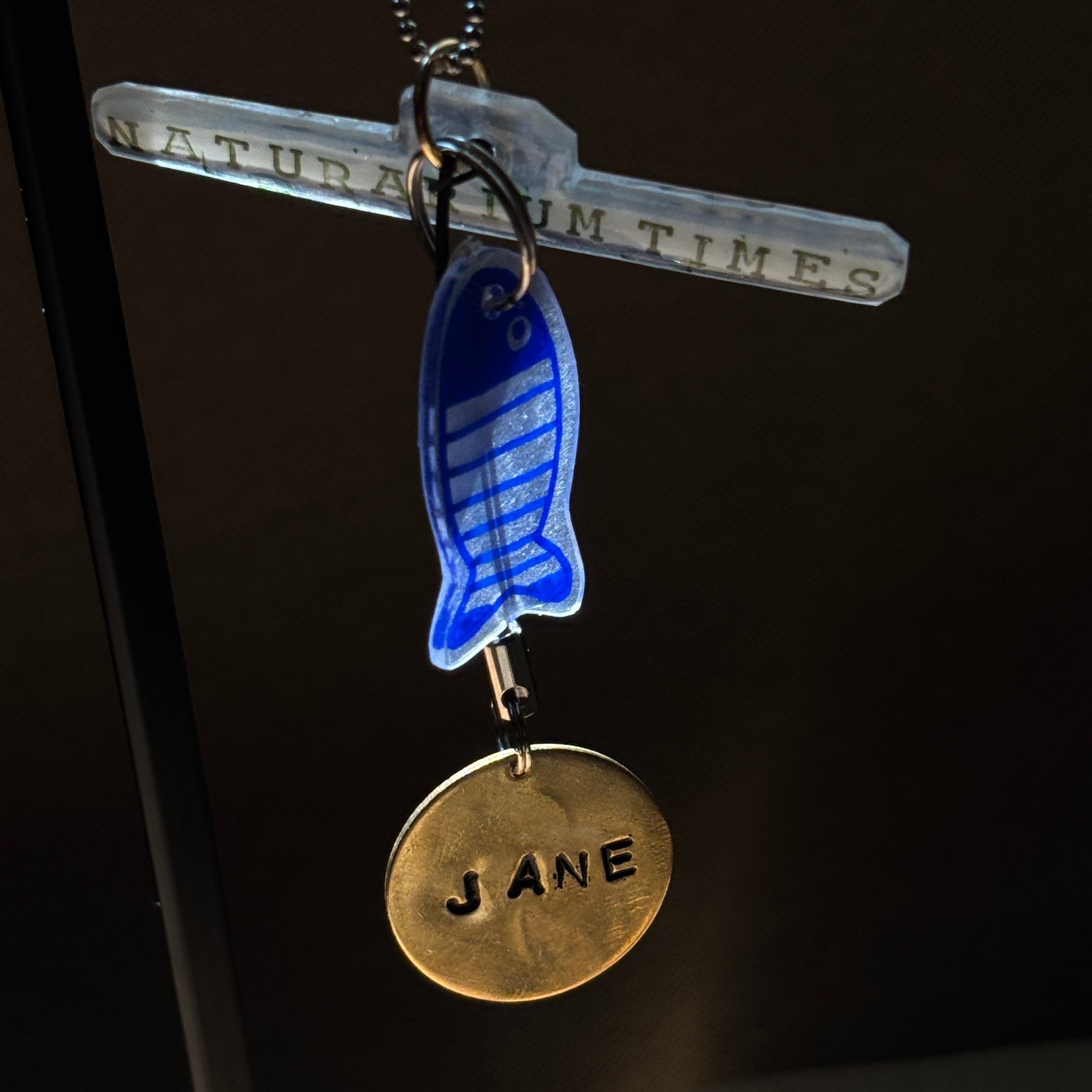 写真は一例で、表面に Jane (4文字)、裏面に葉っぱマーク2枚とNT(NATURARIUM TIMESの略)と打刻してあります。
