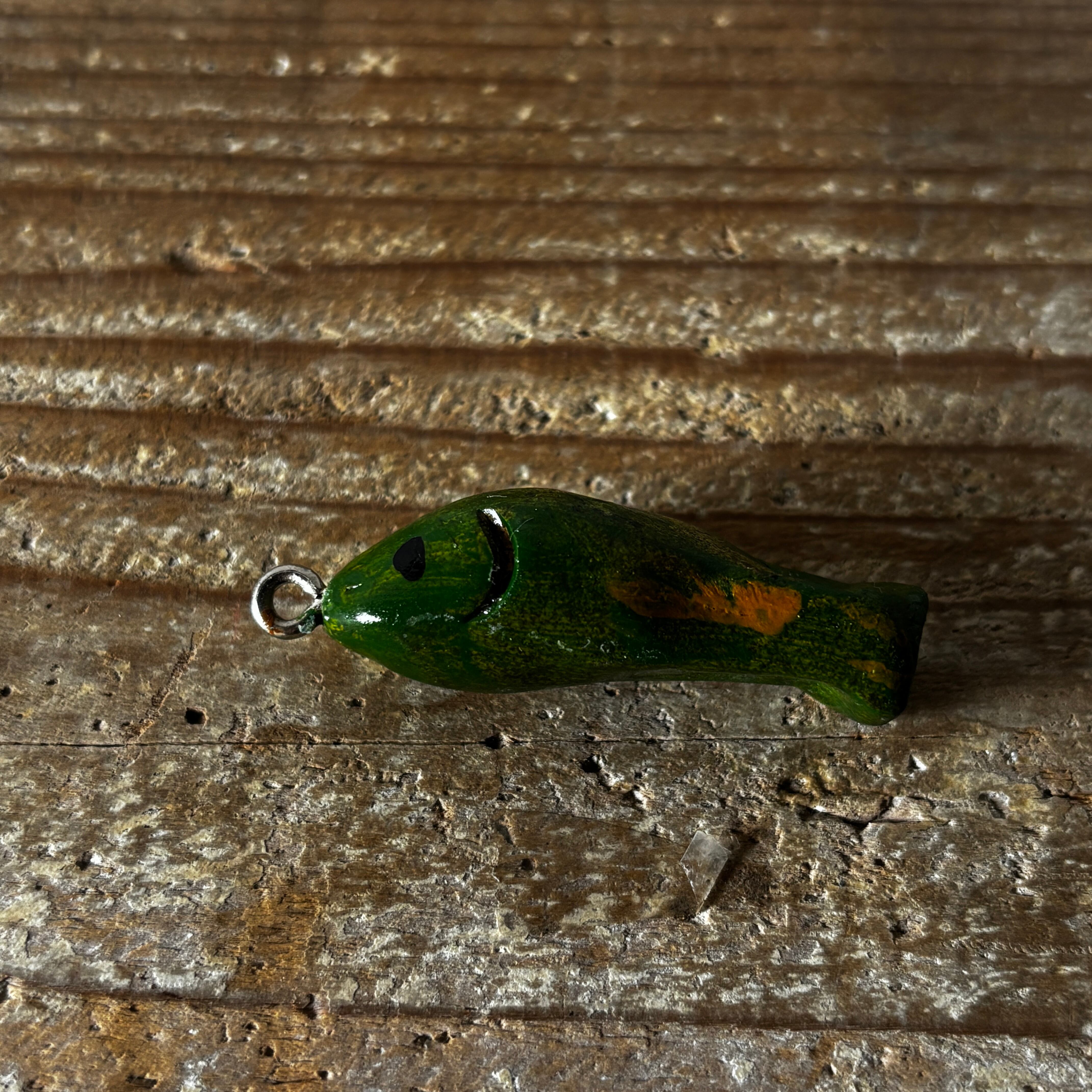 オーブンで制作した陶器のオブジェです。翡翠のように見えなくもない、鮮やかでありシックでもあるグリーンのおさかなです。黄色っぽい模様がついています。紐ストラップ付きでお送りしますが、頭部の丸カンにお好みのアクセサリーパーツ(紐やチェーンなど)に取り替える事ができます。