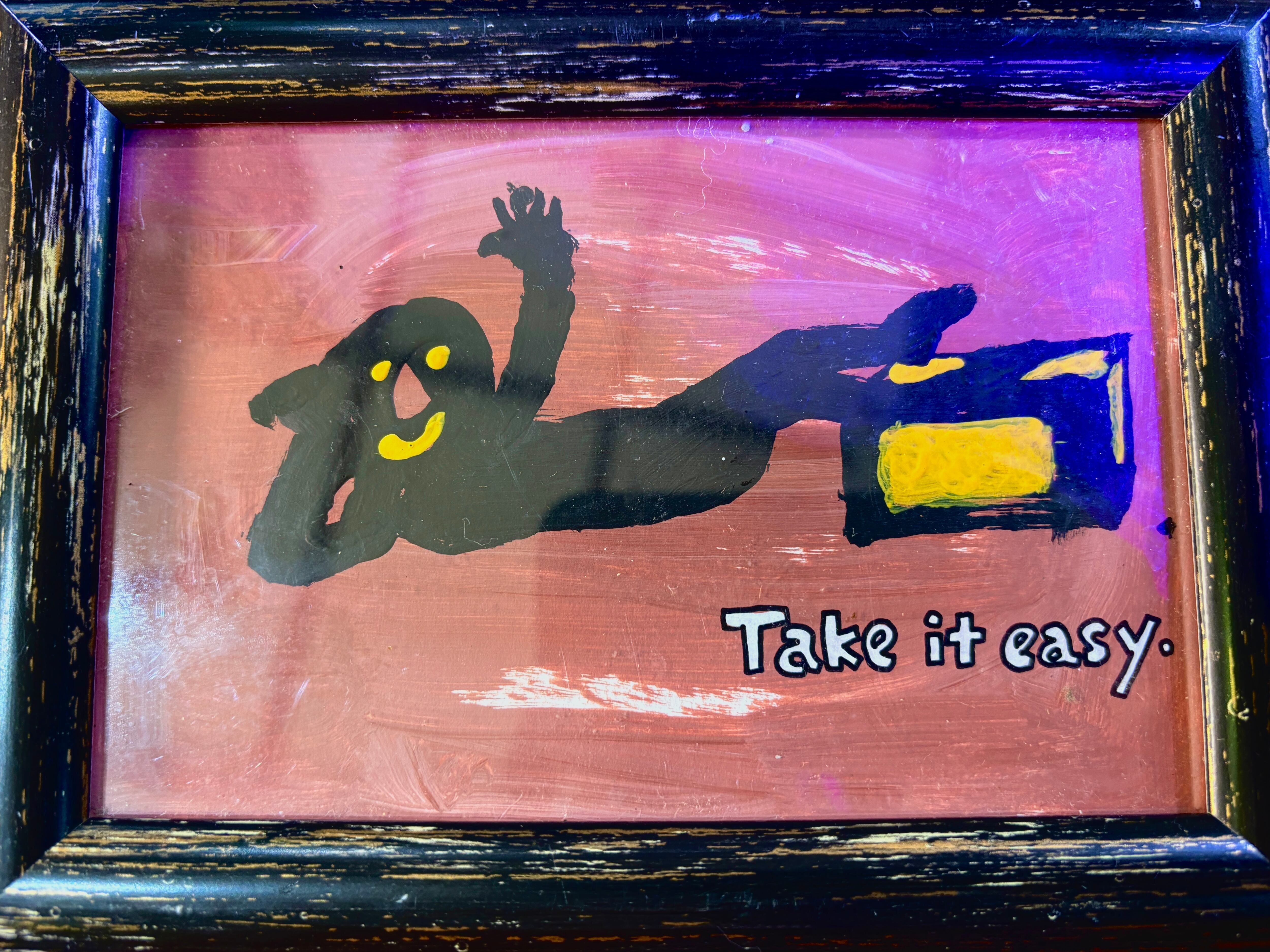 とても緩い感じのリラックスした絵画です。Take it easy (気楽にいこうぜ)というメッセージが添えられています。