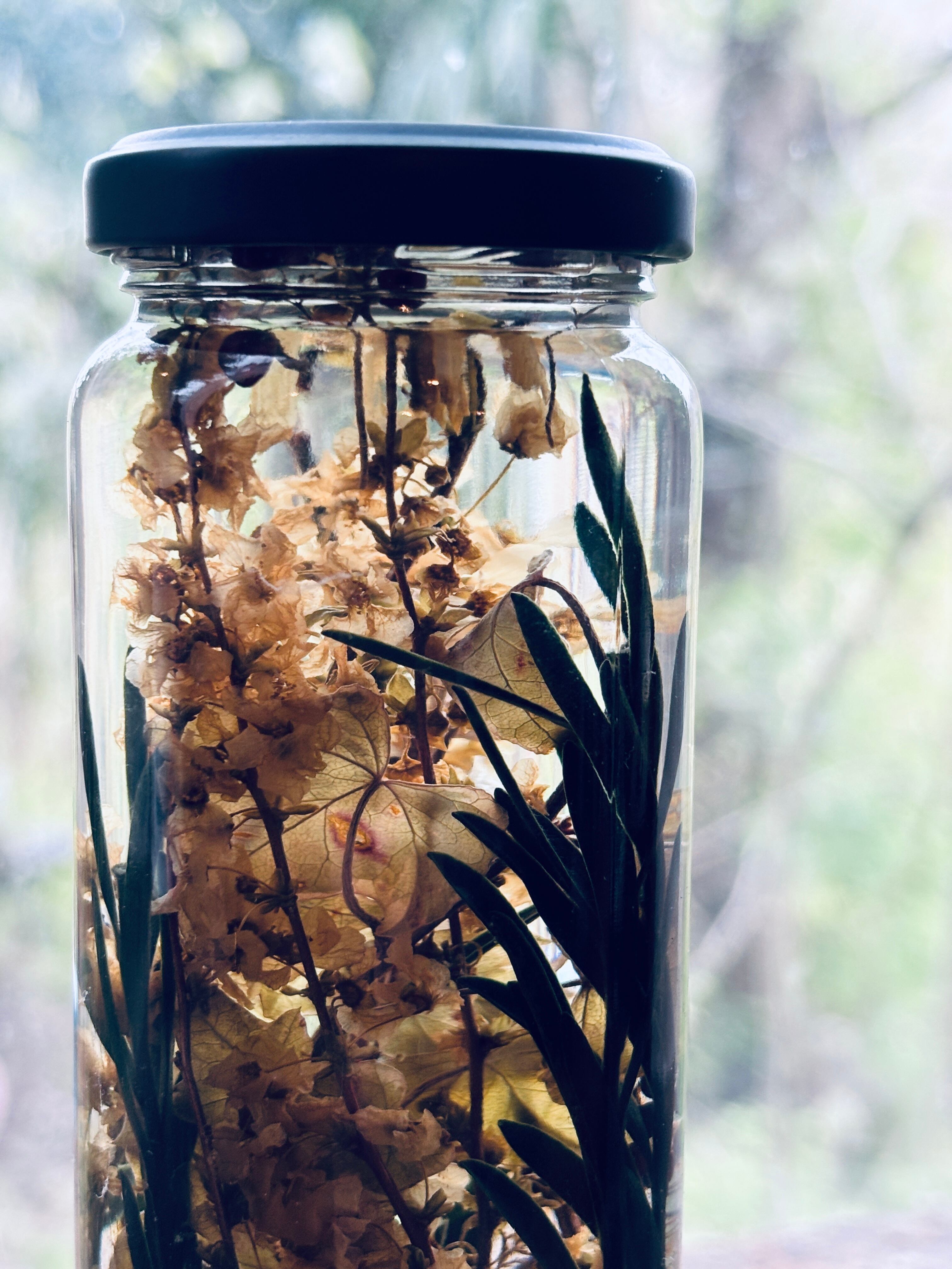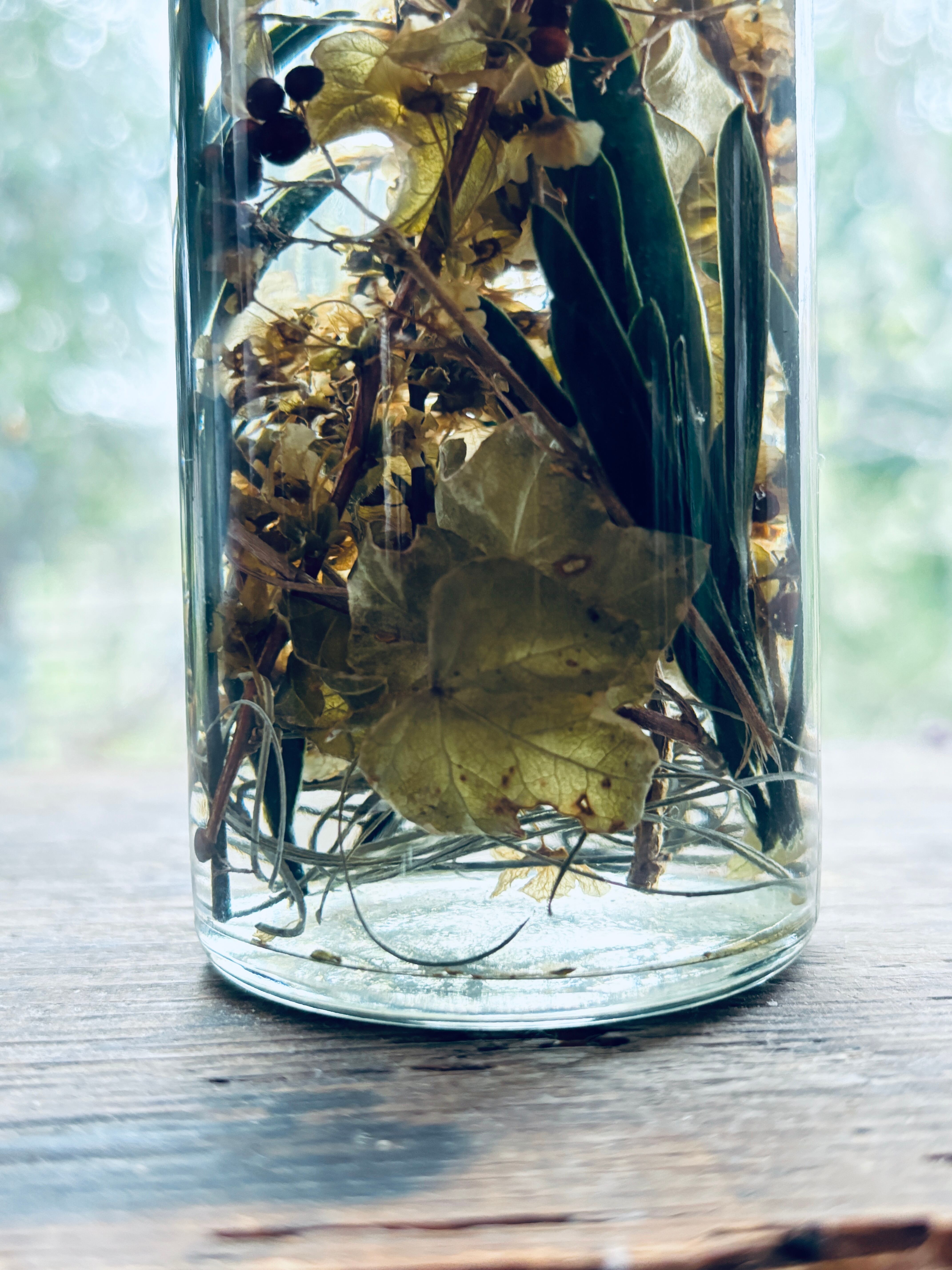 ほのぼのとしたハーバリウムです。シャキッとしていません。どこかまるっこくて、なんでも許してくれそうなドライフラワーたちが入っています。木の実や差し色のグリーンが頼もしいです。アイビーも、経年で庭のアイビーも色が薄くなっておりますが、探せばそのかわいらしいフォルムを発見できると思います。渋めで優しい雰囲気が好きな方におすすめの、長細いボトルのタイプです。(蓋は黒色マット)