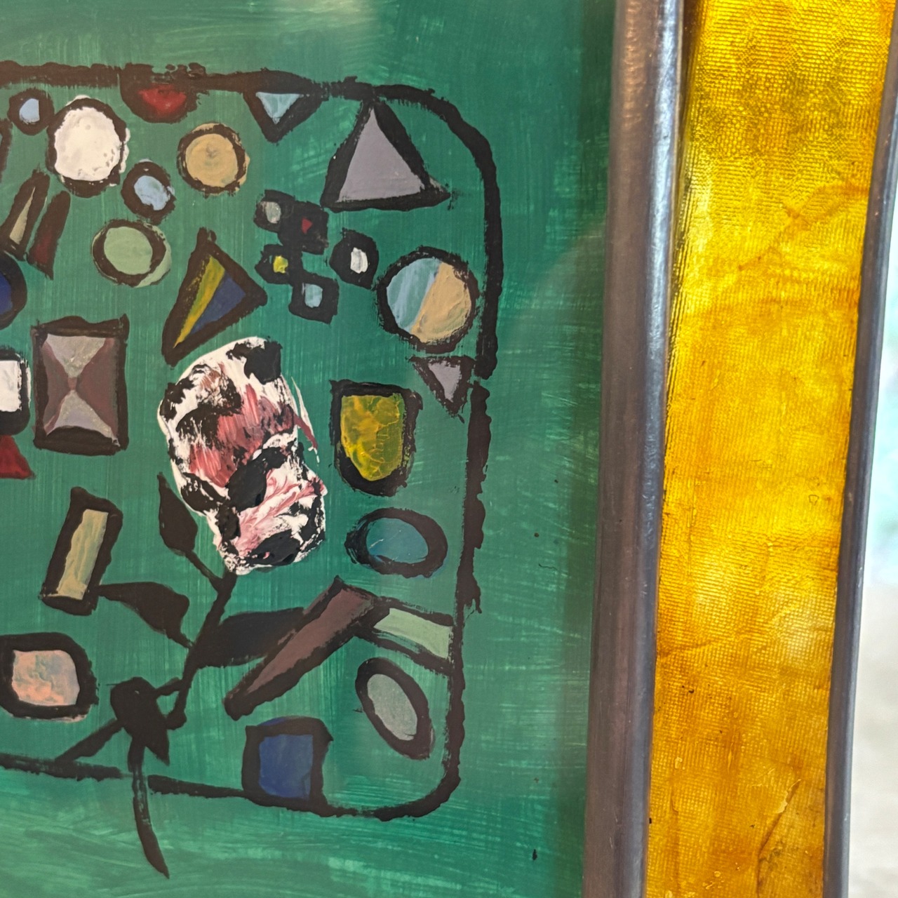 色んな色をミックスして出来上がったグリーン系の色を背景に、自由な発想で思うままに描きました。一応述べておくと中央下部にあるのは花のイメージです。