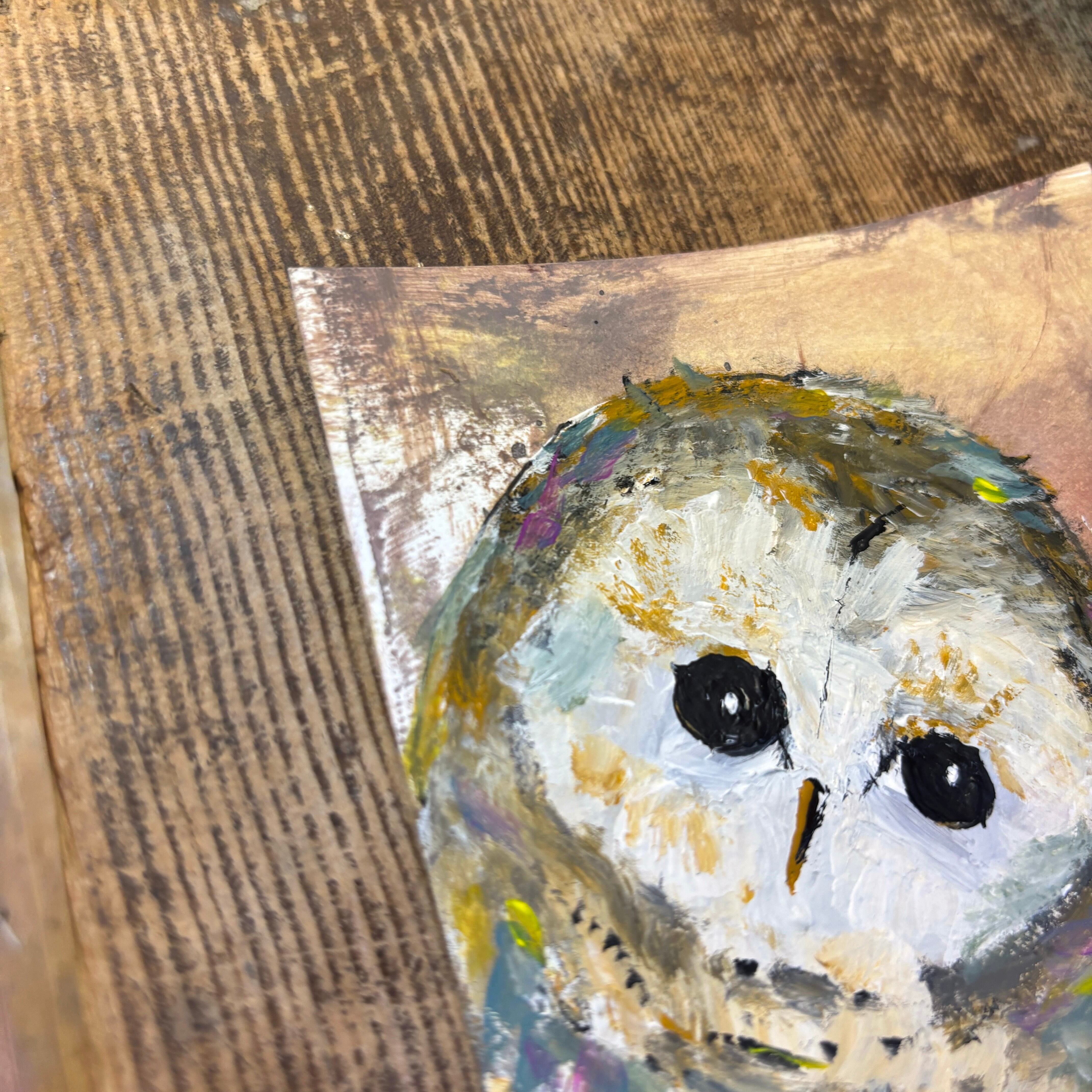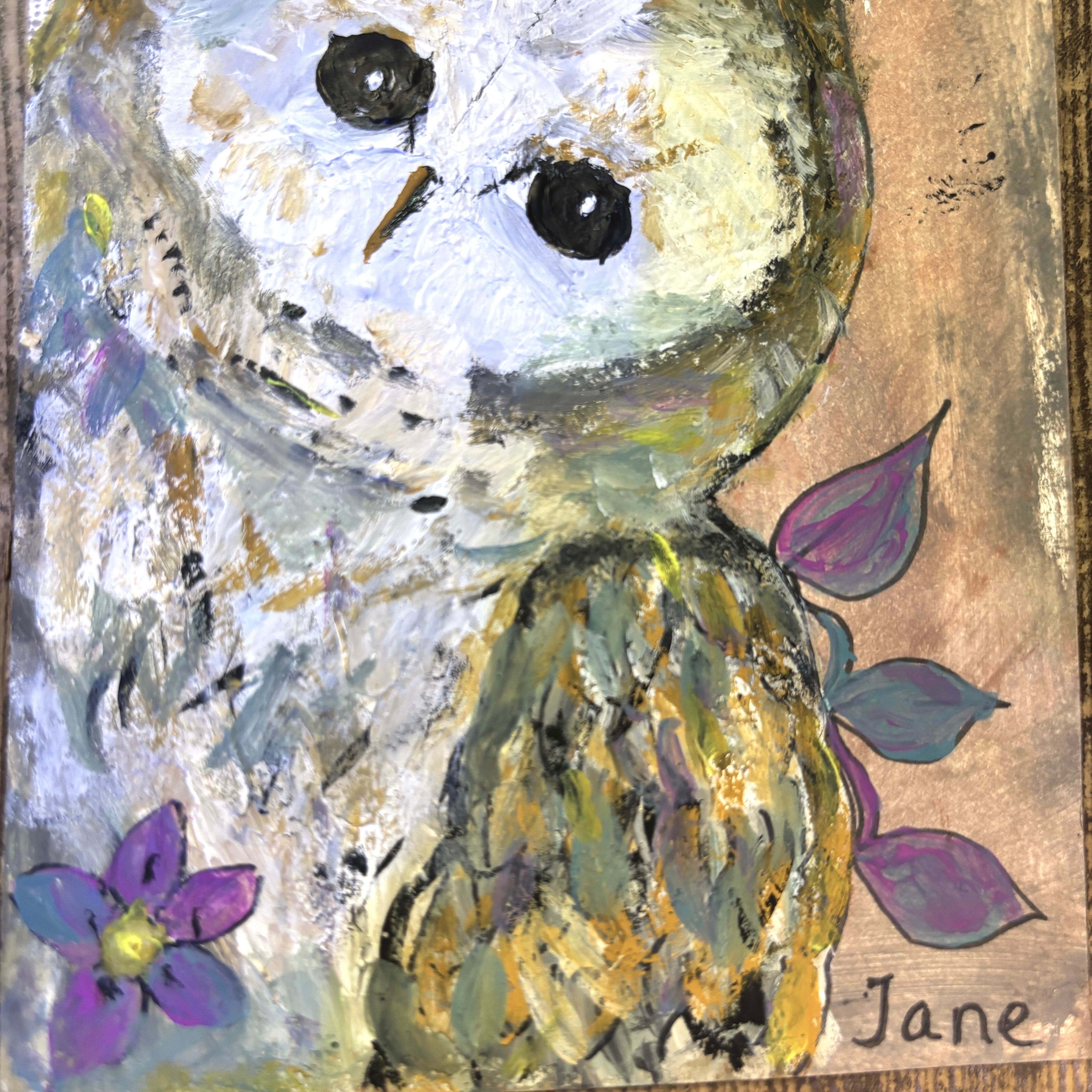 小首を傾げたキュートなフクロウです。よく見ると色鮮やか。羽の雰囲気を出す事に尽力しました。ふくろう=不苦労、ですね。