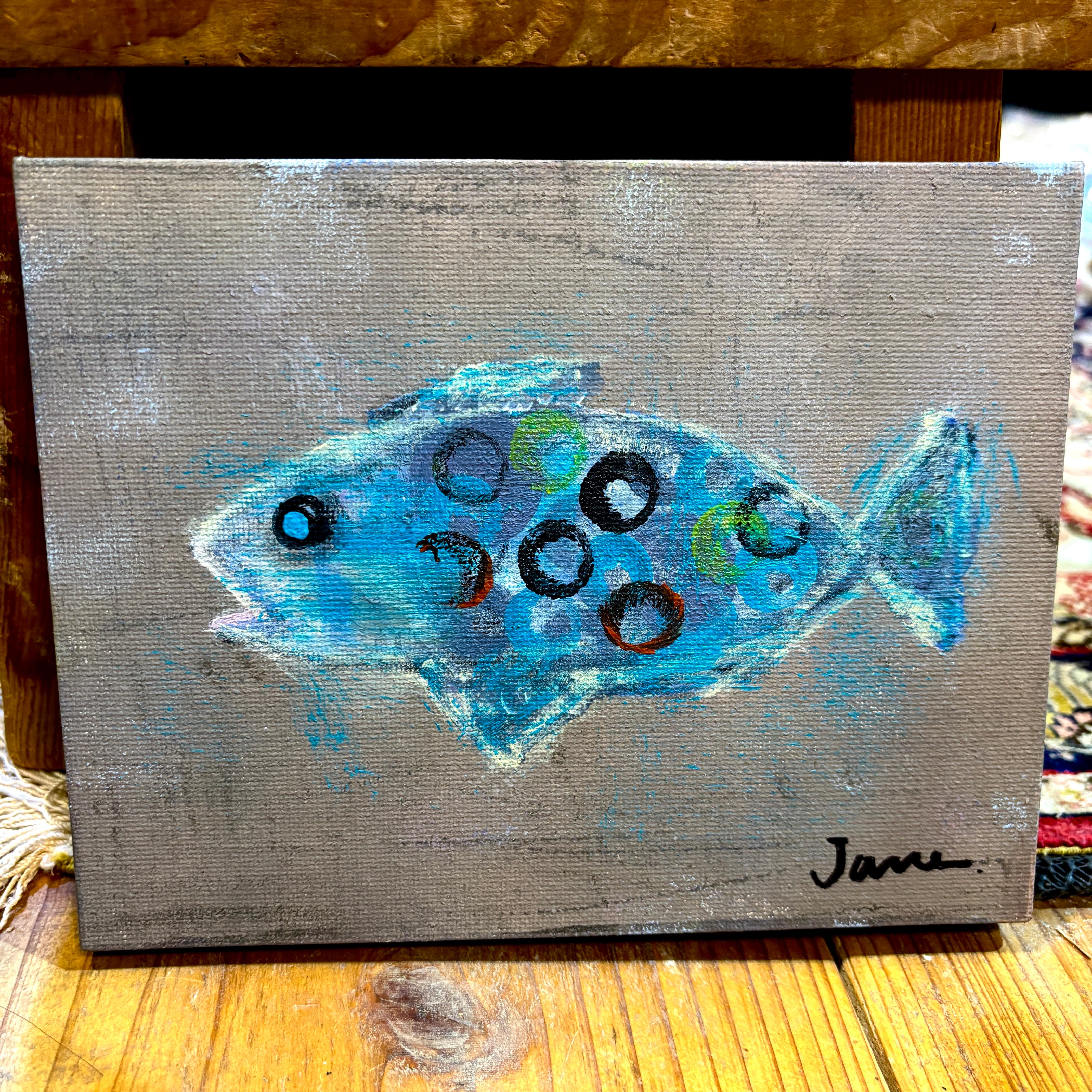 小さなキャンバスに浮き上がる、存在感のある魚。作者の想像から生まれた魚。この世で唯一無二のこの小さな魚にはポテンシャルがあります。ゆったり感も相まって。
