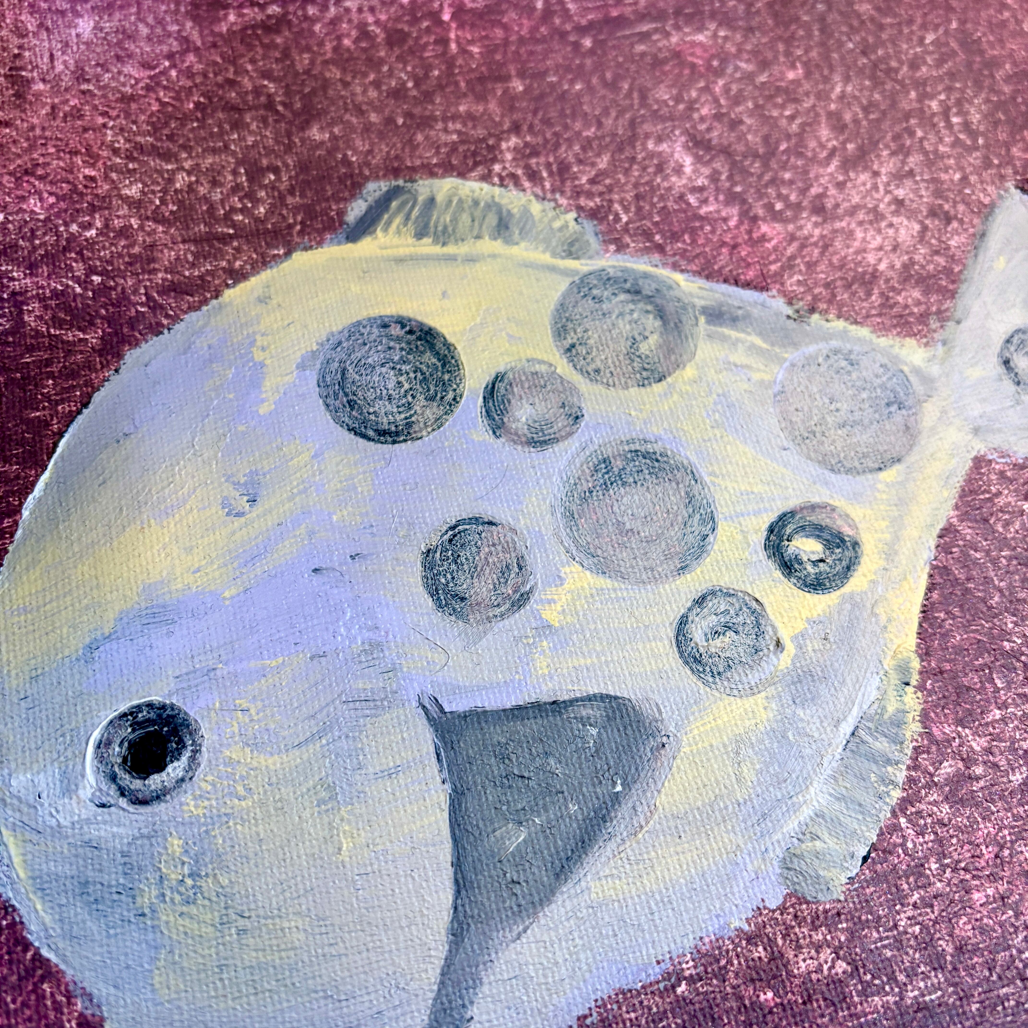 たくさんの色で構成された背景と、魚達。浮いているように泳いでいるかわいいぷっくりとした幸せそうなお魚です。